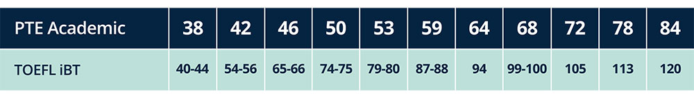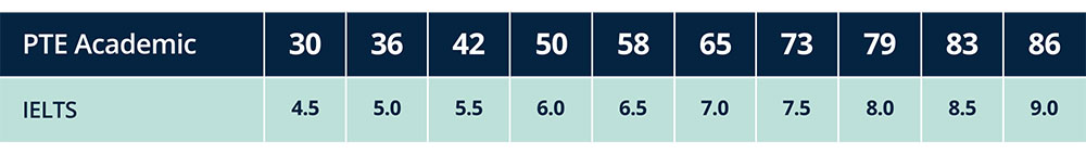 تم تسجيل PTE Academic وفقًا للمقياس العالمي للغة الإنجليزية، وهو مقياس بأسلوب مقياس الحرارة يمنحك نظرة عامة دقيقة على مهاراتك. يتوافق المقياس العالمي للغة الإنجليزية مع مجموعة متنوعة من الاختبارات والمقاييس الشائعة حول العالم. ويمكن المقارنة بين اختبار بيرسون واختبارات آيلتس وتوفل كما يلي :